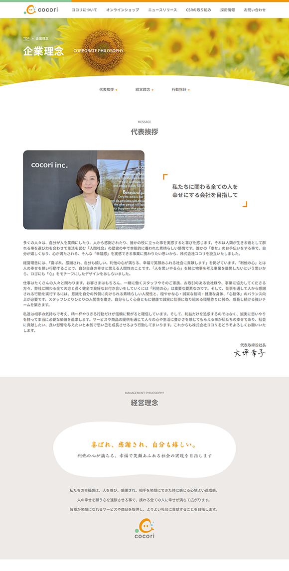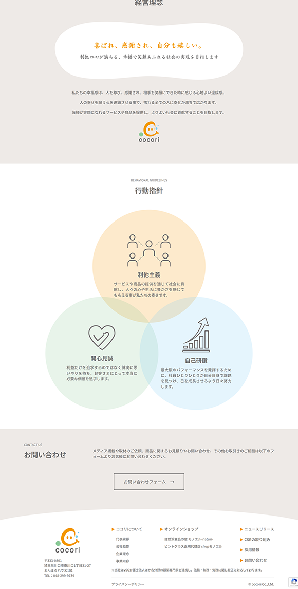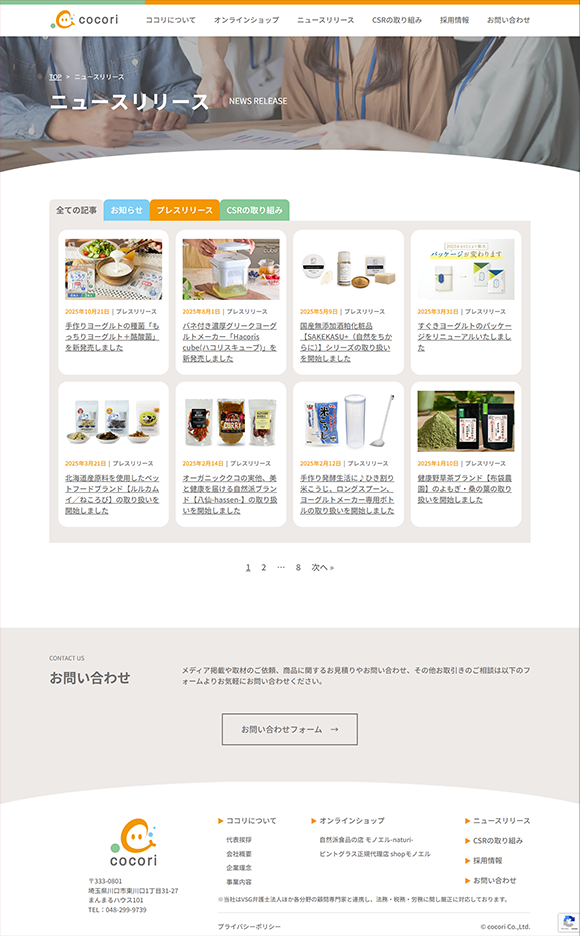 Web ホームページ制作|株式会社ココリ https://cocori.jp/ ロゴの色合いや柔らかなトーンからインスピレーションを広げ、企業としての誠実さや親しみやすさが伝わるデザインを目指しました。 WordPressでオリジナルテーマを作成し、ニュースリリース・CSRの取り組み・採用情報(募集要項)については、お客様自身で簡単に新規作成・編集ができる仕組みを実装しています。 担当範囲: 構成設計/デザイン/コーディング/写真撮影(人物・外観) Gallery < > 一覧へ戻る