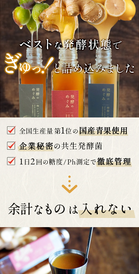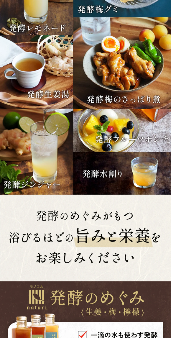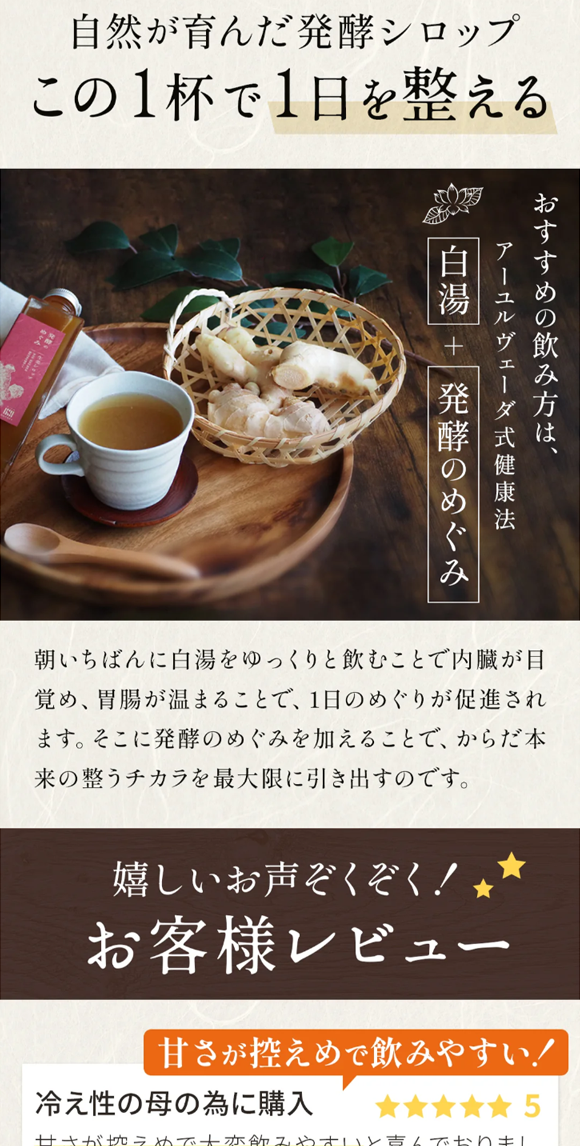 Web LP|国産発酵シロップ https://mono-yell.com/pages/hakko-no-megumi 素材や製法へのこだわり、味わいの魅力を「読むことで体感できる」構成を意識して設計しました。 文字情報とビジュアルのコントラストを用い、商品の背景価値を丁寧に伝えることで、価格への納得感から購入へつなげるデザインに仕上げています。 担当範囲: 構成設計/デザイン/コーディング Gallery < > 一覧へ戻る